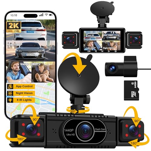 NOLYTH Dash Cam Front and Rear 4-Channel: Front 2K + Rear Left Right 1080P Dashcam with 5G WiFi APP Control 64GB Card Night Vision 360 View 8 IR Lamps Interior Car Camera for Baby/New Drivers