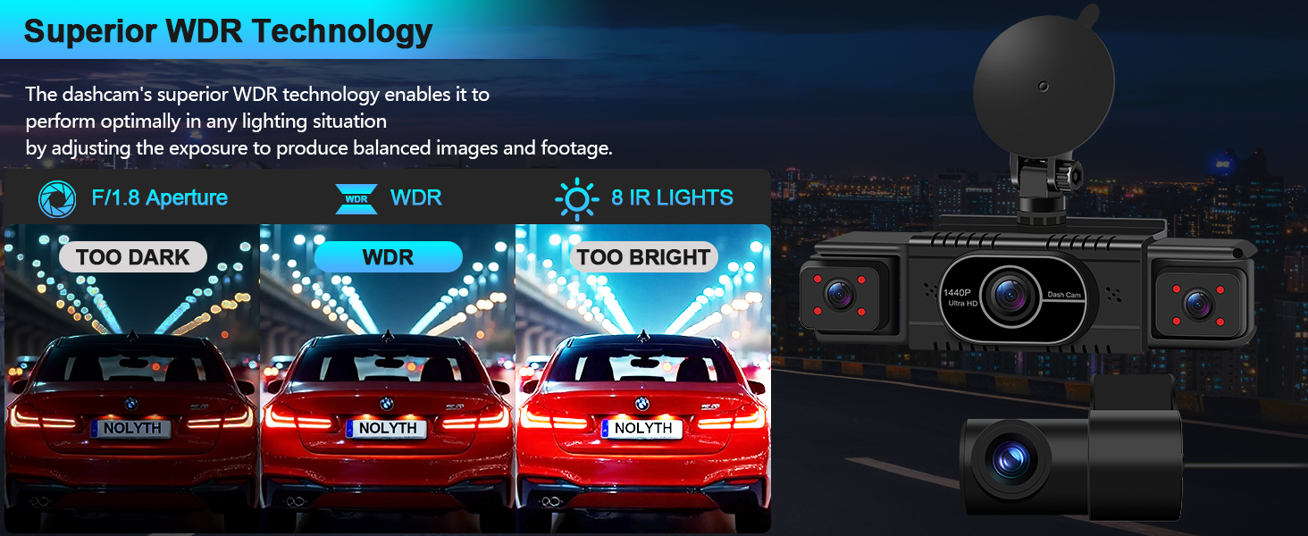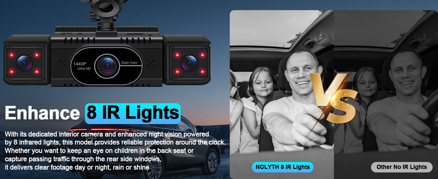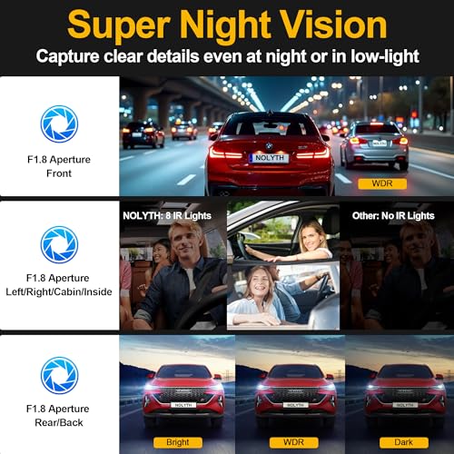 - Night Vision and 8 IR Lights: Advanced optical lenses with large F1.8 aperture and WDR technology capture sharp images in low-light conditions, thereby improving safety when using this dashcam front and rear camera at night. The 2 inside(cabin) cameras include 8 IR lights that enable clear recording in complete darkness, allowing you to keep an eye on passengers, check on the baby and interact with your child while driving