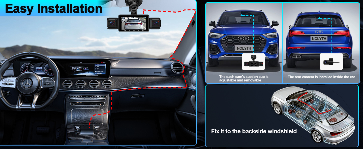 - Easy Installation: The NOLYTH front and rear dash camera comes with a pry tool and cable clips for effortless mounting. It is perfectly suited for sedans, trucks and SUVs. The 5.5m waterproof rear camera can be installed inside the vehicle. The left and right side (cabin) cameras can be used inside the vehicle to monitor babies or pets, allowing you to interact with them in real time. The smart app control feature makes the dash cams easy to share real-time traffic updates and memorable journeys