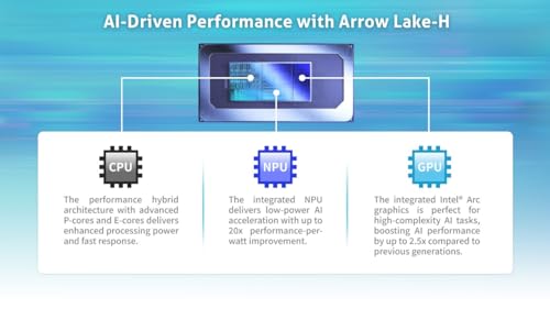 The NUC Ultra 200 BOX Series, powered by Intel Core Ultra 200H precessors(Arrow Lake-H), brings advanced AI capabilities with up to 99 Platform TOPS for diverse workloads. It features a responsive CPU, an integrated Intel Arc GPU, and a dedicated NPU for efficient and continuous AI processing. The Series is engineered to provide optimal performance across a wide spectrum of AI applications in compact, power-efficient systems.