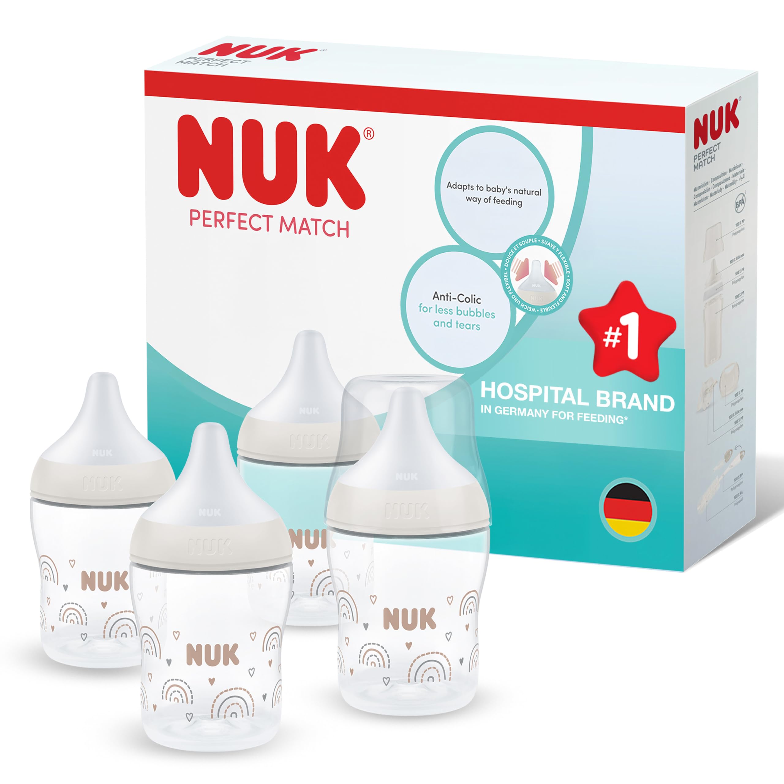The NUK Perfect Match Baby Bottle is a safe choice when considering baby essentials for newborn care. Designed to closely mimic the feel of breastfeeding, this innovative bottle helps support a gentle transition between breast and bottle feeding for both baby and parent. The soft and flexible bottle teat is made from skin-like silicone that adapts to baby’s natural way of feeding. Paired with a soft, wide lip rest, it encourages instinctive latching – ideal for families moving from breast to bottle and back without disrupting feeding routines. NUK’s trusted anti colic air system reduces air intake during feeding. Fewer bubbles means fewer tummy upsets, less gas and calmer feeds – perfect for newborns and infants prone to fussiness. Recommended by healthcare professionals and trusted by families worldwide, NUK is the #1 hospital brand in Germany for feeding*. With 98% baby acceptance**, this bottle helps parents feel confident in their choice. The Temperature Control indicator is a thoughtful addition that changes colour when the milk is too hot***, taking the guesswork out of warming bottles. *Calculation based on teats sold to hospitals by Newell Brands relative to birth and feeding statistics, www.cdc.gov; www.statista.com **Independent Market Research, Germany 2023 ***Please check the temperature again before feeding