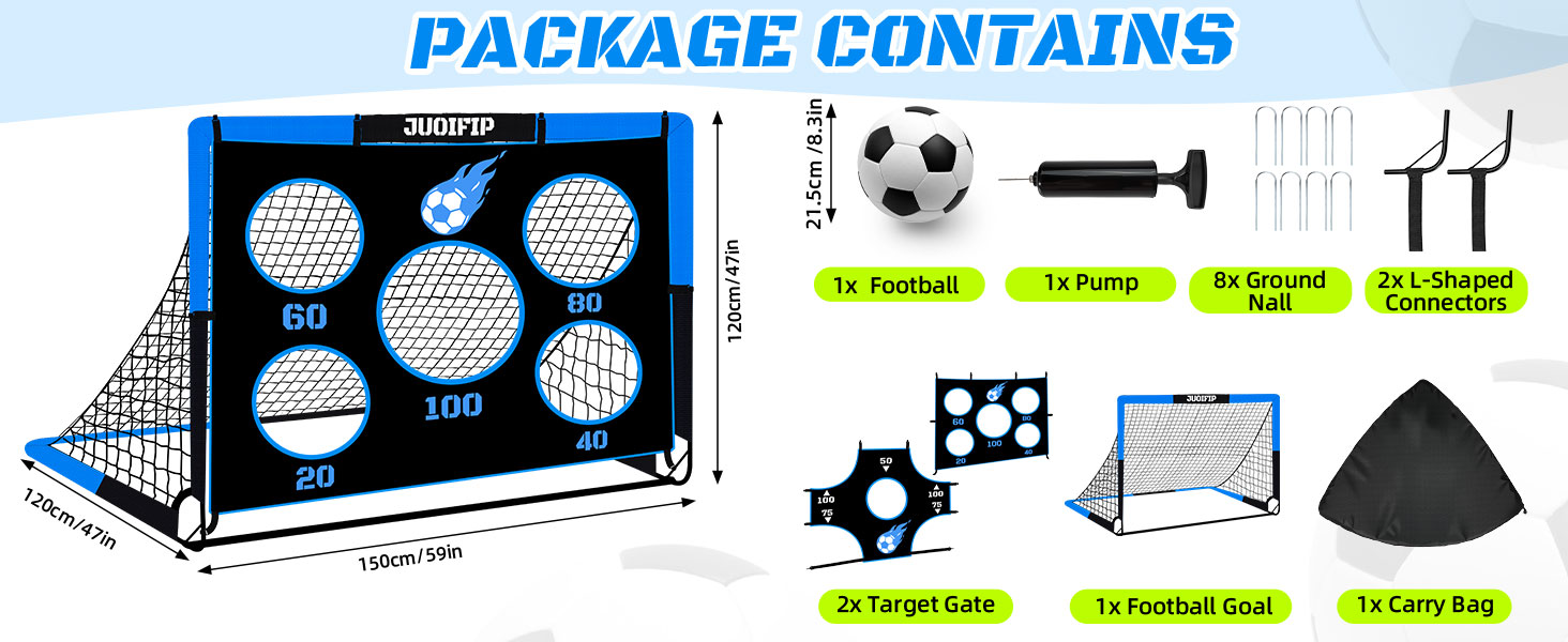 Three-in-One Football Goal Set (Complete with Accessories): The set includes 1 children's pop-up goal, 2 goal nets (5-hole and cross-style variants), 1 size 5 football, 1 carry bag, and 1 product manual. Additionally supplied are 8 ground anchors, ensuring all components are provided without the need for additional purchases.