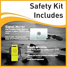 Compact but powerful, the included signal mirror and pealess whistle help rescuers pinpoint your location once they’re nearby. The mirror’s reflective range reaches long distances for daylight signaling, while the whistle provides a sharp, reliable audible alert — simple tools that make a lifesaving difference.