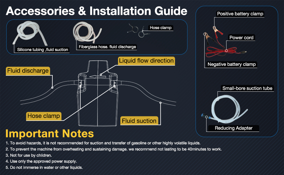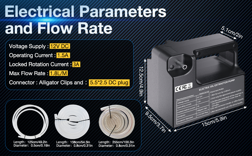 Powerful & Efficient Performance: The oil transfer pump delivers professional-grade performance with 18W motor power for strong suction,1.8 L/min (0.47 GPM) flow rate – faster than most manual pumps,1.5A operating current for energy-efficient use, 40-minute continuous runtime for completing big jobs without interruption. For similar products, it is generally recommended to limit each operation to about 10 minutes to prevent overheating and potential damage to the machine.The optimized design balances power with durability for reliable performance every time.