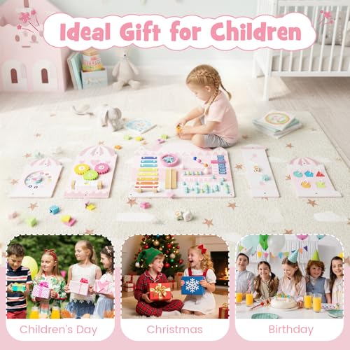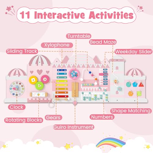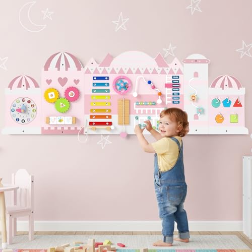 Olakids Castle Sensory Wall, 11 in 1 Activity Wall Busy Board Panels Montessori Toddler Educational Toys Learning Gift for Boys Girls (Pink Castle)
