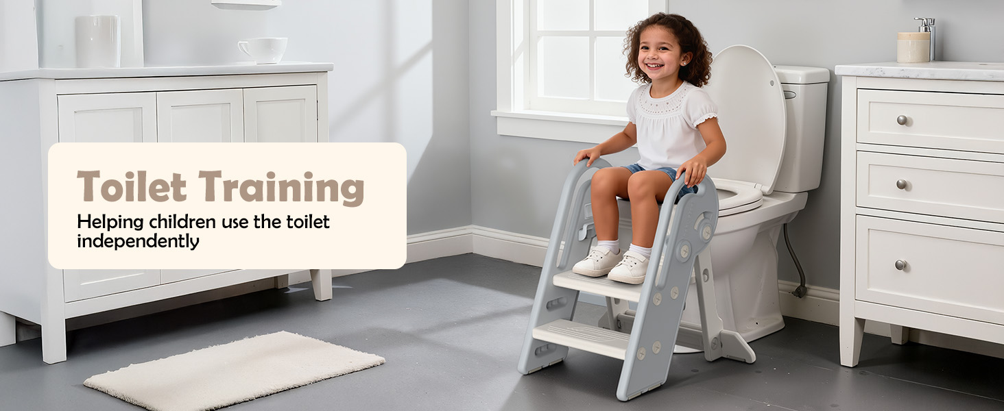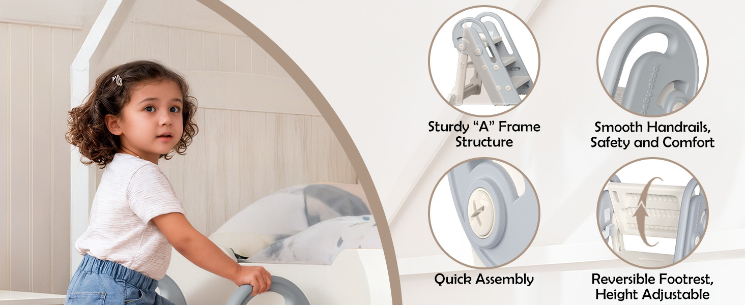 ✨【Stable with Double Anti-Slip Design】Our step stool for kids are made of non-toxic PE, durable and without BPA. Considering the safety of babies, there are anti-slip strips at the bottom of the steps, which can firmly grip the ground, making it solid, durable. Moreover, the well-designed "A" type stable structure, extended support board and easy-to-grip double handles without burrs, allowing your baby to start an independent journey with confidence.