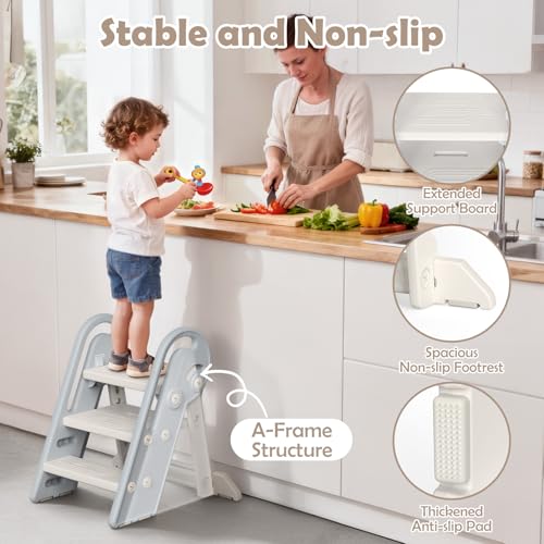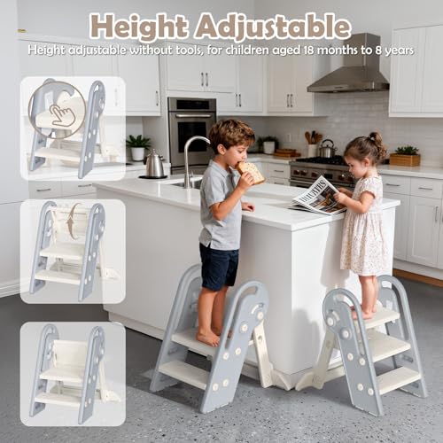 Onasti Foldable Step Stool for Kids, Adjustable 3 Steps for Kid Potty Training with Handles, Learning Tower, Toddler Step Stool for 18 Months to 8 Years, for Kitchen, Bathroom & Bedroom (Grey)