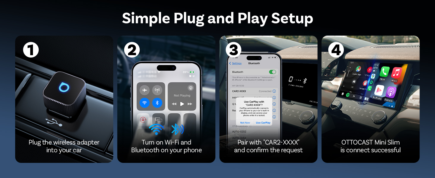 Simple Plug & Play Installation: Installing the OTT OCAST Mini Slim is quick and easy. Just plug it into your car’s USB Type‑C port, and the adapter will automatically detect your device and connect. No complicated setup or additional software needed after the initial pairing, making it a truly plug‑and‑play solution.