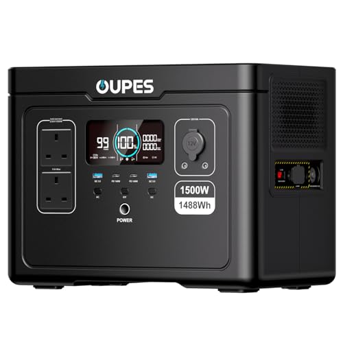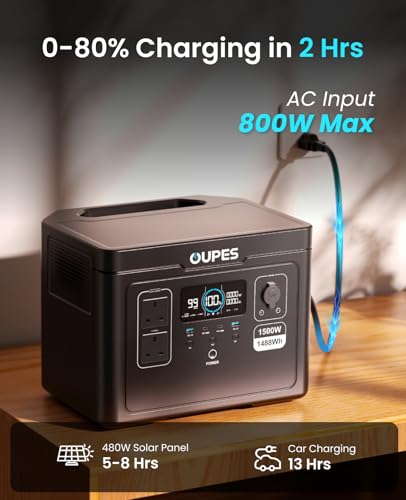 OUPES Exodus 1500 Portable Power Station, 1488Wh LiFePO4 Battery Solar Generator, 1500W(3600W Surge) AC Outlets, UPS, Dual 140W USB-C Outputs for Home Backup, Outdoor Camping, Off-grid, Power Outages