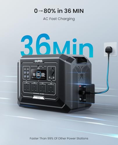 - [Fast Charging from 0-80% in 36 Mins] – OUPES Mega 1 portable power station features two charging modes: 1400W fast charge(0-80% in 36 mins) and 700W slow charge. Fast charge is perfect when you need power in a rush. For non-urgent use, slow charge is better—it preserves long-term battery health, prolongs its lifespan, and is more energy-efficient too.