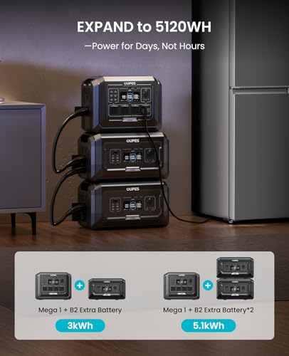 - [Expandable up to 5kWh] – Connect it to the OUPES B2 extra battery (2048Wh), and the Mega 1 portable power station reaches a huge 5120Wh capacity – compared to a maximum of 2kWh from others. It’s ideal for home power outages, emergency backup, outdoor camping, off-grid living, road trips, caravanning and RVs. Keep your essential gear running with ample backup power, whether you’re off exploring or dealing with unexpected power cuts.