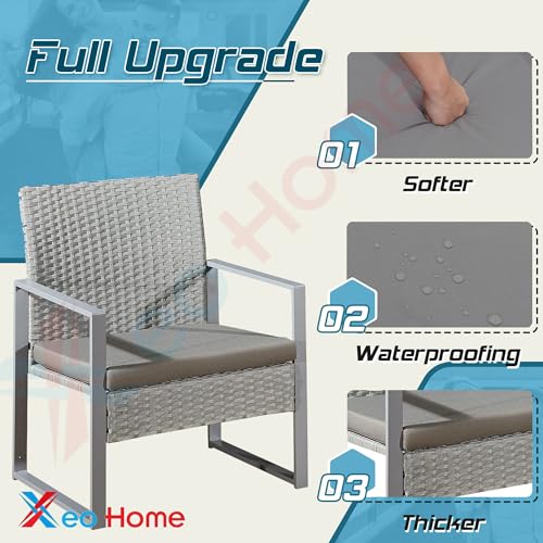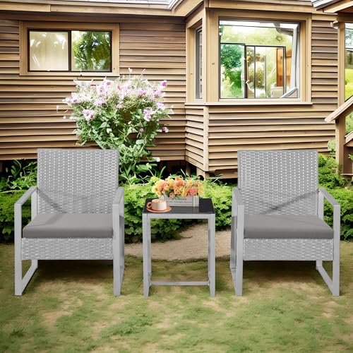 Outdoor 3-Pieces Rattan Bistro Set Wicker Garden Furniture Conversation Set, Coffee Table with Glass Top and 2 Chairs and Washable Removeable Cushions for Balcony Backyard Pool side (Grey)