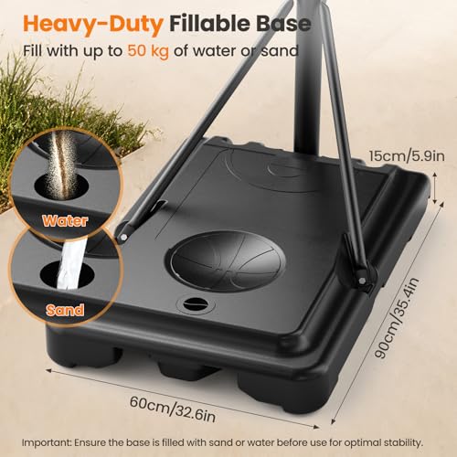 - Stable Base (Fill with Water or Sand): The heavy-duty base holds up to 65 kg of water or sand for maximum stability. Paired with double support poles and a wide base, it stays firmly in place through every jump shot and slam dunk.