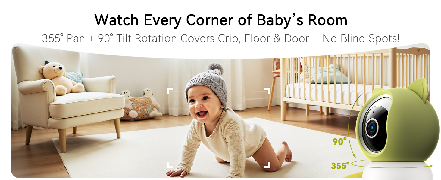 - 【355° Rotation & Auto-Tracking】355° pan, 90° tilt for complete room monitoring. And the auto-tracking function follows baby adventure, never miss a moment