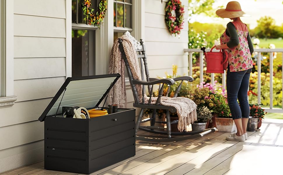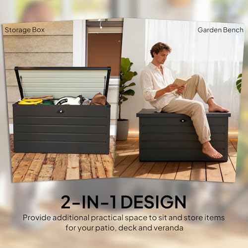- Two-in-one design: Large outdoor storage box doubles as a garden storage bench. Fit with a cushion for a comfortable sitting spot. Use inside for keeping garden tools, outdoor equipment, soft furnishings and more.
