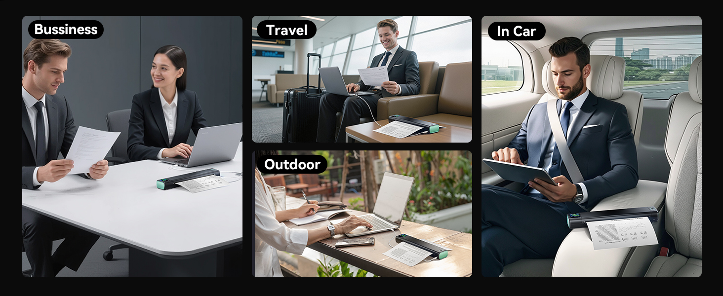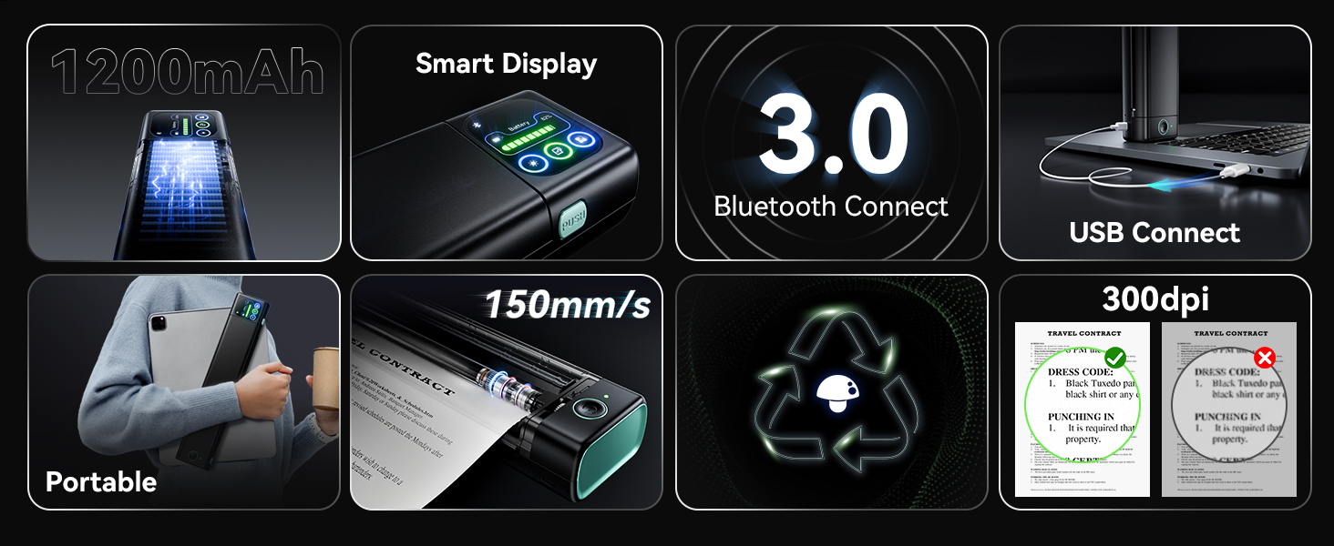 Mini printer: Lightweight (745g) and incredibly compact (325mm67mm40mm). This printer fits perfectly in backpacks and pockets, making it ideal for professionals working on the go, small offices, construction sites and students