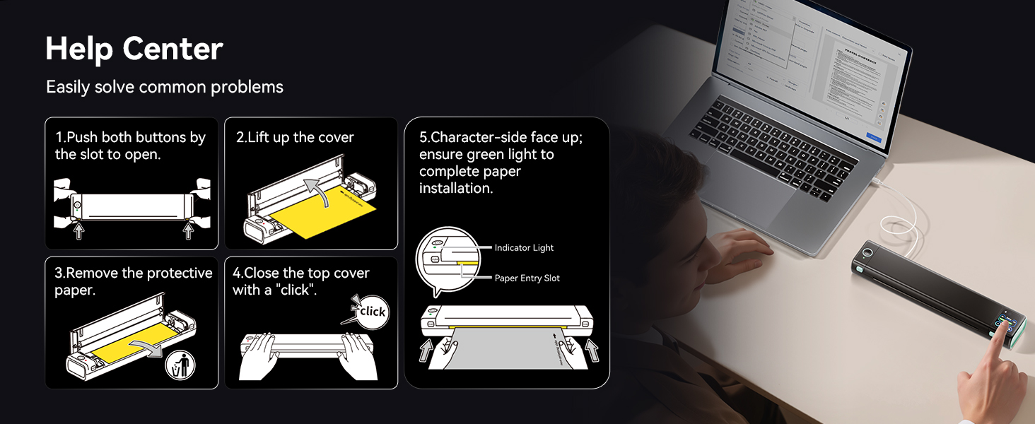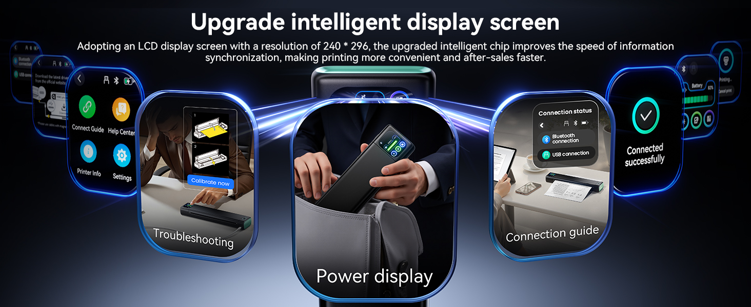 Merchant video 1 Smart Display Screen 2 Power Display 3 Quick Connection 4 Quick Calibration 5 Help Center 1 Phomemo M08D Printer 2 Battery Upgrade 3 Bluetooth Upgrade 4 No ink