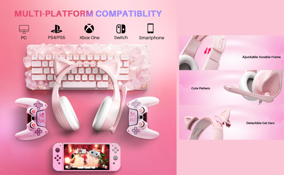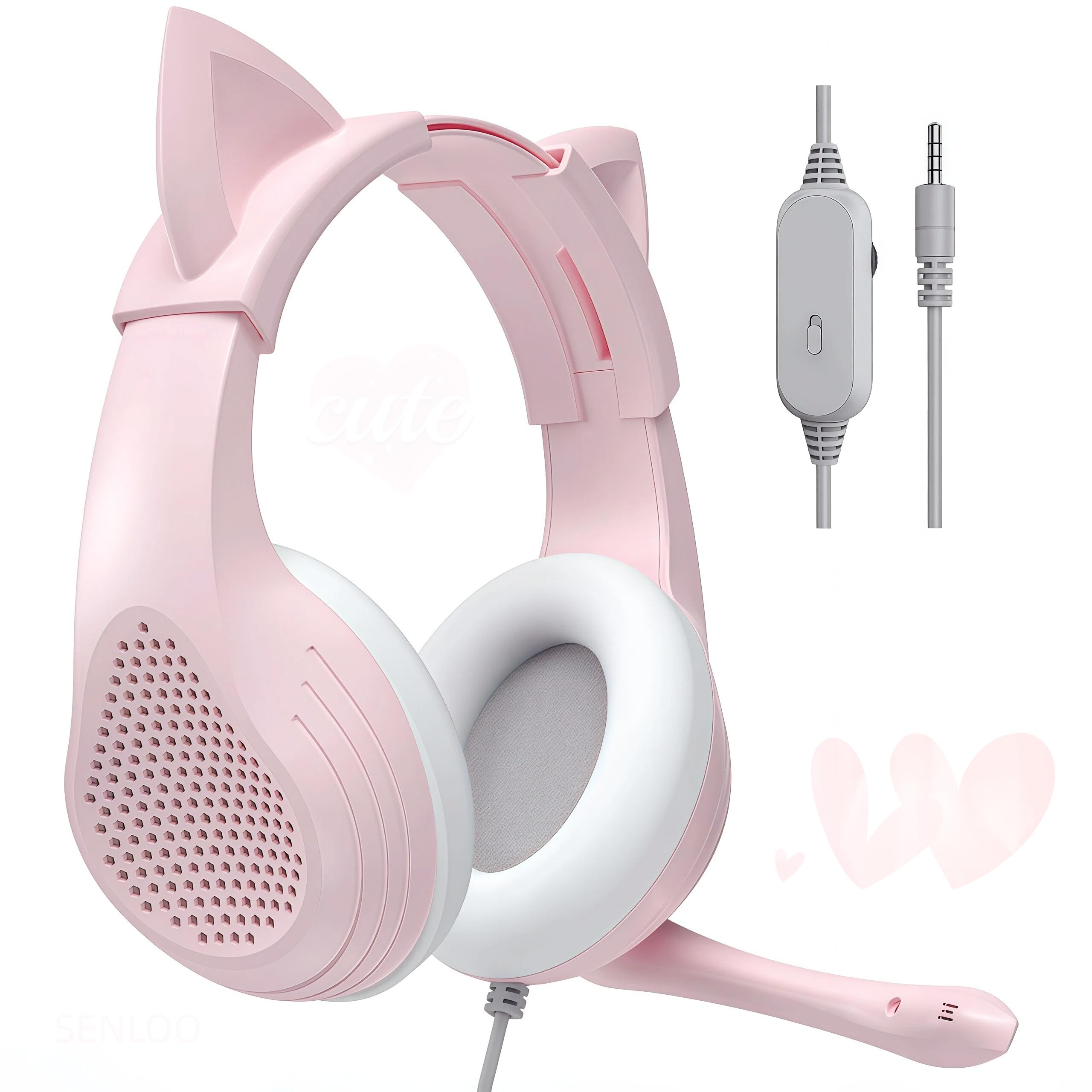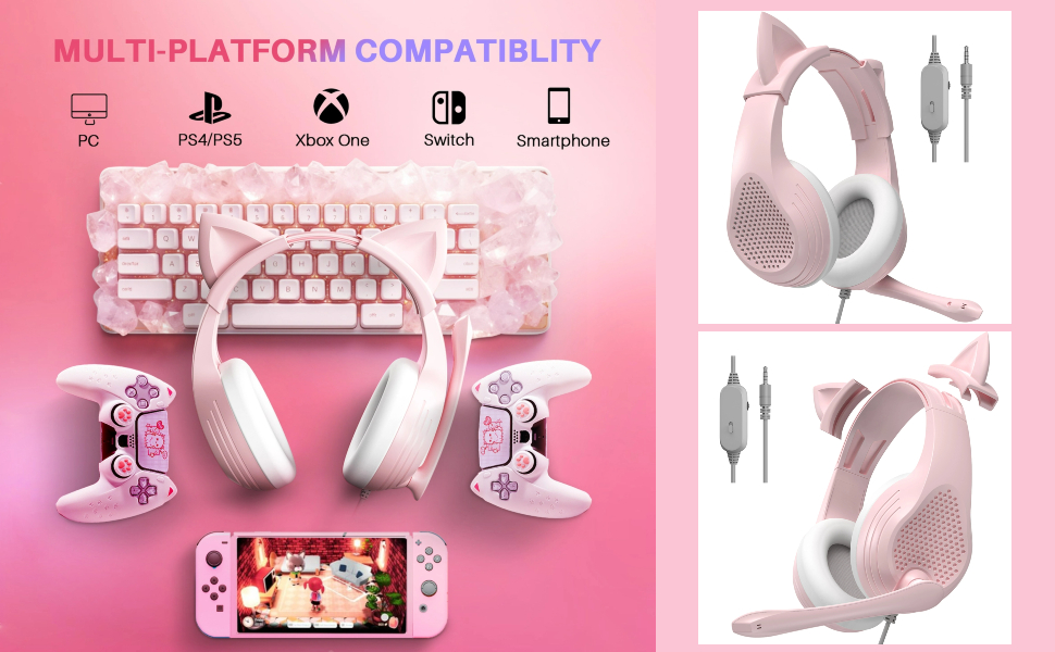 - Kitty Cute: Soft pink headphones with attached cat ear design on adjustable headband for extra kawaii style while gaming.