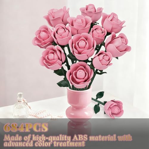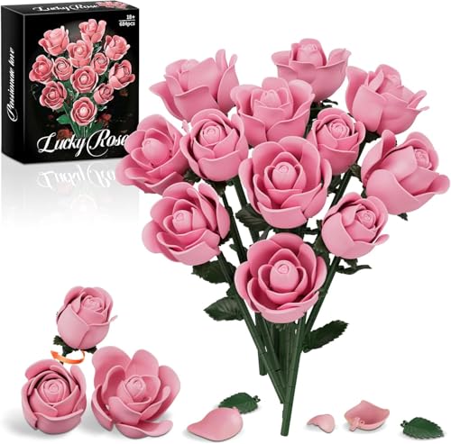 Pink Rose Bouquet Building Set of 12,Pink Artificial Roses Valentines Day Gifts Botanical Collection Building Block for Birthday, Anniversary, Mother'S Day,Home Decor,684 PCS