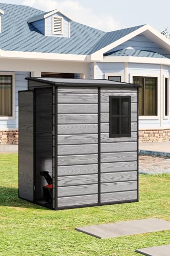 Plastic Garden Storage Shed with Floor and Window, 4.5×3.6 FT Lockable Lean to Garden Shed, Waterproof Outdoor Sheds for Gardening Tools & Equipment, 138x110x192cm, Wood Grain Dark Grey