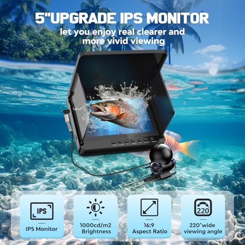 Portable Fish Finder Camera, Underwater fishing Camera with 5 inch IPS Monitor 14LED IR Infrared Lights, Waterproof Fishing Video Cameras for Ice, River and Boa