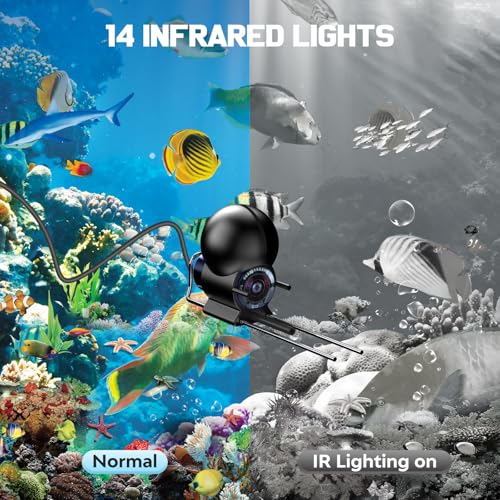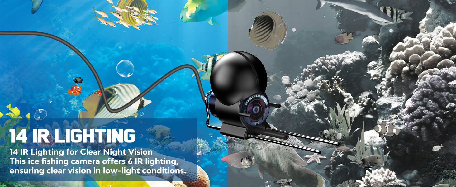 - Advanced Waterproof Camera: 220°vision and IP68 waterproof High Definition camera with sunshade and 14 infrared LED, which can be clearly displayed in sunlight, night fishing in low light, muddy water and other conditions, fish conditions at a glance; can be adjusted through the main body of the buttons (menu key, +, – key) such as LED and other brightness (note: infrared LED light up when the image is a black-and-white display).