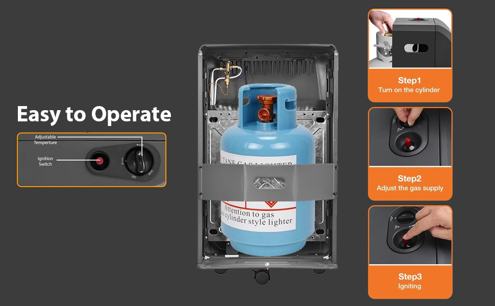 EASY SETUP & OPERATION: The heater includes a built-in gas canister slot for simple clip-in installation, along with a regulator and hose. It requires no electricity to operate, making it perfect for garages, workshops, camping trips, tents, and outdoor events.
