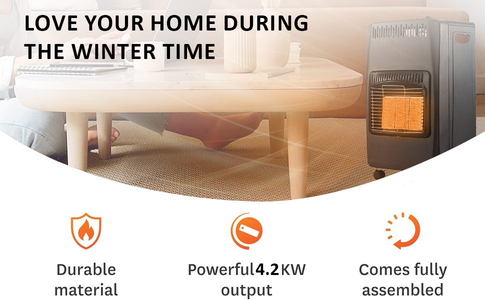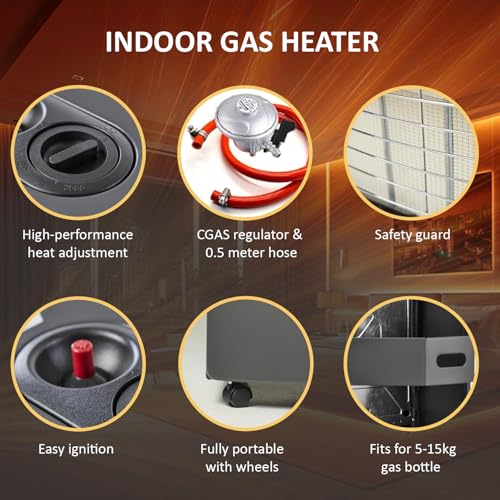 INSTANT POWERFUL HEATING: With a maximum output of 4200W, the heater warms up your space quickly and efficiently. It supports standard 15kg gas bottles and is compatible with LPG, butane, and propane, making it ideal for instant heat in any situation.