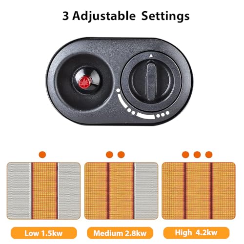 3 ADJUSTABLE HEAT SETTINGS: Choose from three heating modes (1.5KW, 2.8KW, and 4.2KW) to suit your comfort needs. The user-friendly controls and piezoelectric ignition system allow for effortless operation and quick startup.