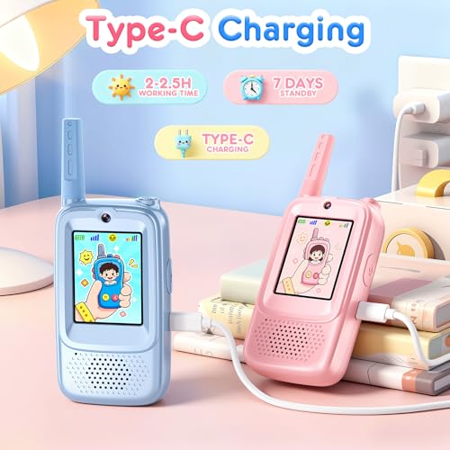 - [Safe & Perfect Gift]Built with eco-friendly ABS material and 1v1 channel encryption, these safe walkie talkies for kids include rechargeable batteries with Type-C charging. Durable and eco-friendly, these versatile kids walkie talkies make ideal gifts for birthdays, Christmas, and various indoor-outdoor activities.