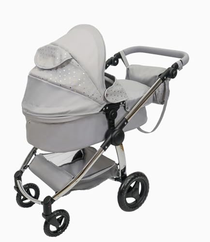 The stylish and versatile 2-in-1 doll travel system Easily switches from carry cot to pushchair mode Stylish chrome features Convenient front swivel wheels Foldable design for compact storage Doll not included Assembled dimensions: 72L x 41.5W x 81H cm Folded dimensions: 73L x 39W x 13H cm Contents: x1 toy pushchair, x1 removable canopy, x1 apron, x1 carriage bag Assembly Required: Yes Warning: SMALL PARTS – CHOKING HAZARD. Not suitable for children under 3 years