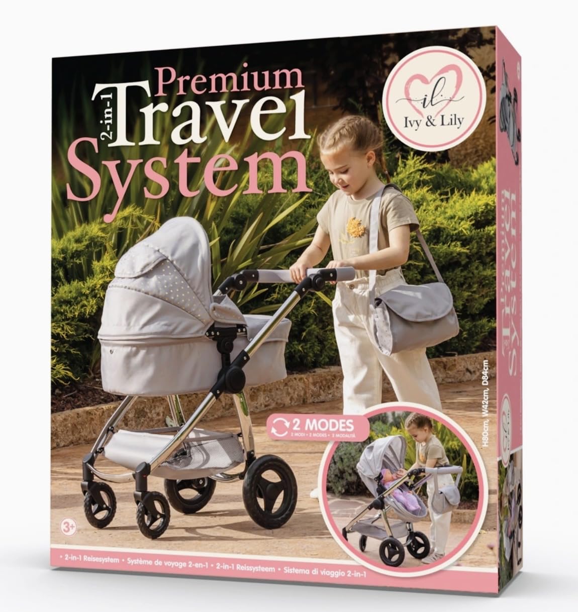 featuring convenient front swivel wheels for easy manoeuvrability. This travel system is perfect for parents who are always on the go, with a versatile design that suits both boys and girls aged 3 and above. With its sleek and modern design, this travel system is sure to turn heads wherever you go. It’s ideal for trips to the park, shops, and other outdoor activities. Plus, its compact size makes it easy to transport when not in use. Order now and enjoy a comfortable and stylish ride for your little one! Features The stylish and versatile 2-in-1 doll travel system Easily switches from carry cot to pushchair mode Stylish chrome features Convenient front swivel wheels Foldable design for compact storage Doll not included Assembled dimensions: 72L x 41.5W x 81H cm Folded dimensions: 73L x 39W x 13H cm Contents: x1 toy pushchair, x1 removable canopy, x1 apron, x1 carriage bag Assembly Required: Yes Warning: SMALL PARTS – CHOKING HAZARD. Not suitable for children under 3 years