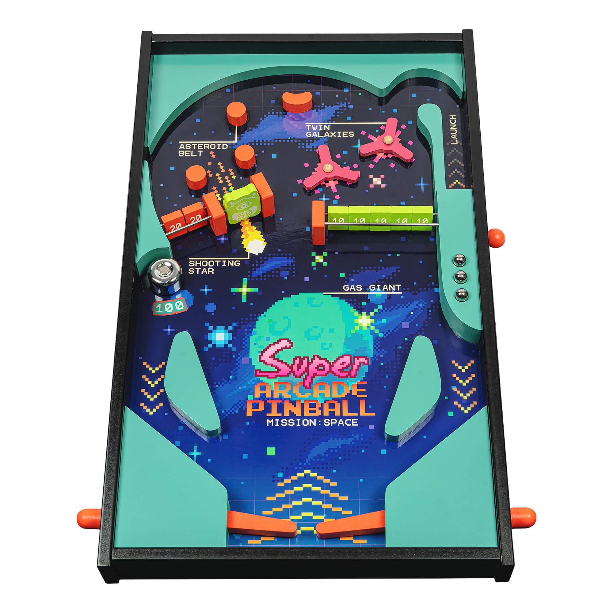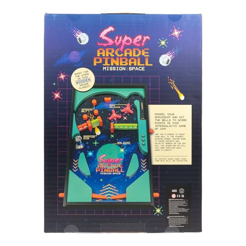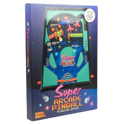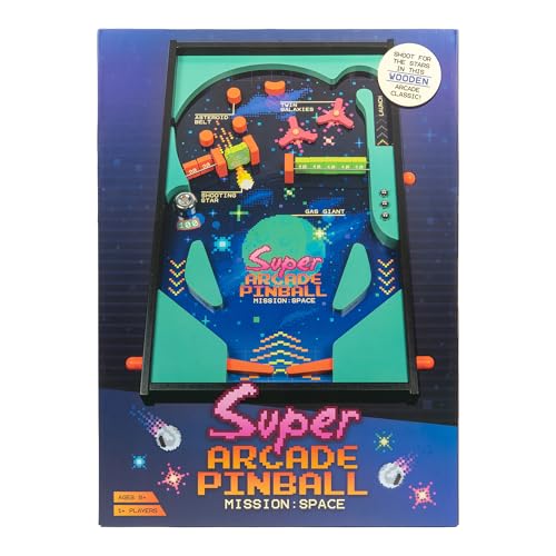 Bring classic arcade excitement into your home with the Professor Puzzle Super Arcade Pinball, a fast-paced tabletop game packed with nostalgic charm. Crafted from vibrant, durable wood, this retro-inspired pinball board features pixel-style artwork and interactive obstacles that make every launch unique and exciting. Simply load one of the metal balls, pull back the launcher, and use the flippers to fire your ball across the board, aiming for the highest scoring zones while dodging rockets, bumpers, and galactic hazards.