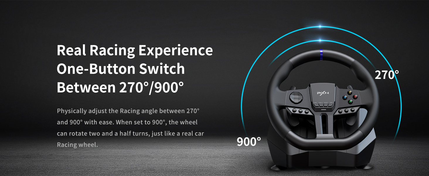 - ADJUSTABLE DRIVING MODES: Switch between 270° and 900° steering angles for arcade-style or simulation racing. Easily toggle between X-Input and D-Input modes to match game support. Perfect for titles like Gran Turismo, Forza, F1, and Mario Kart.