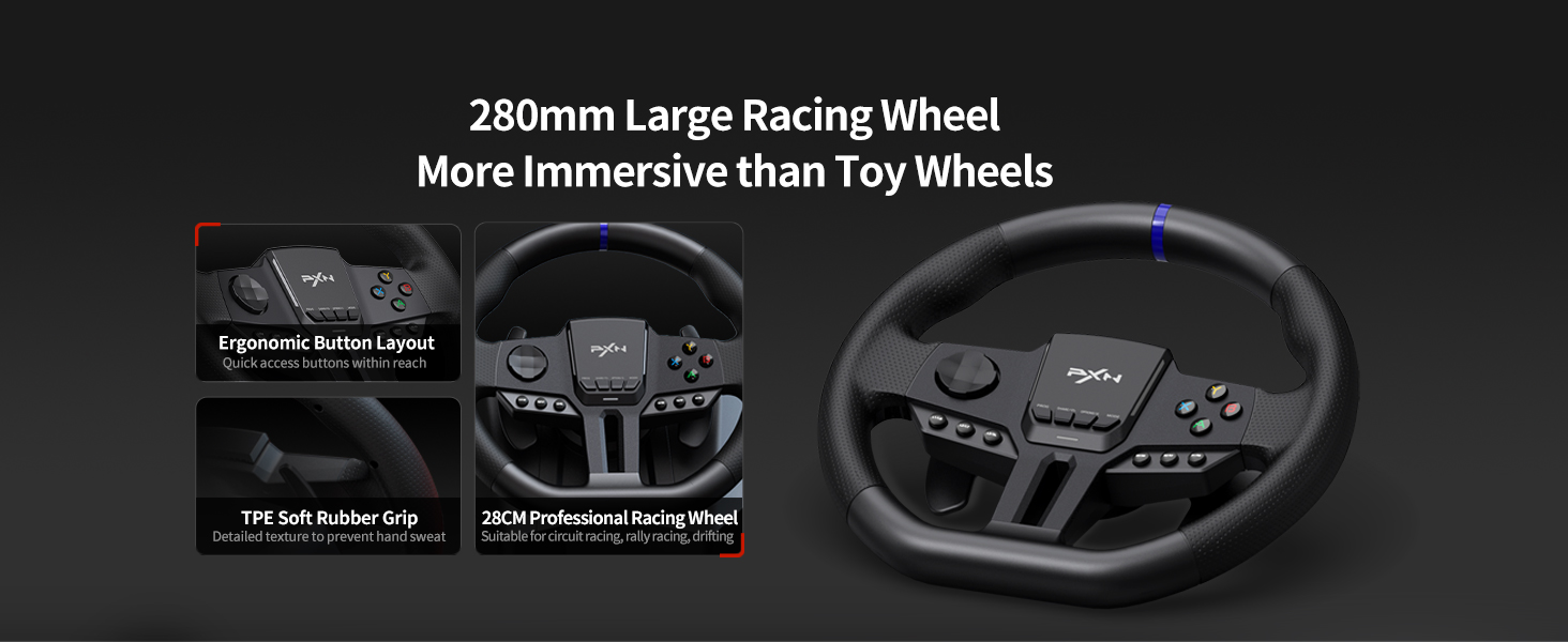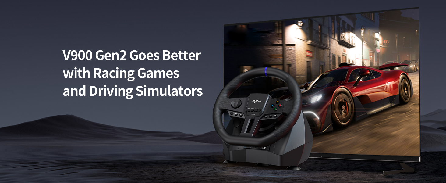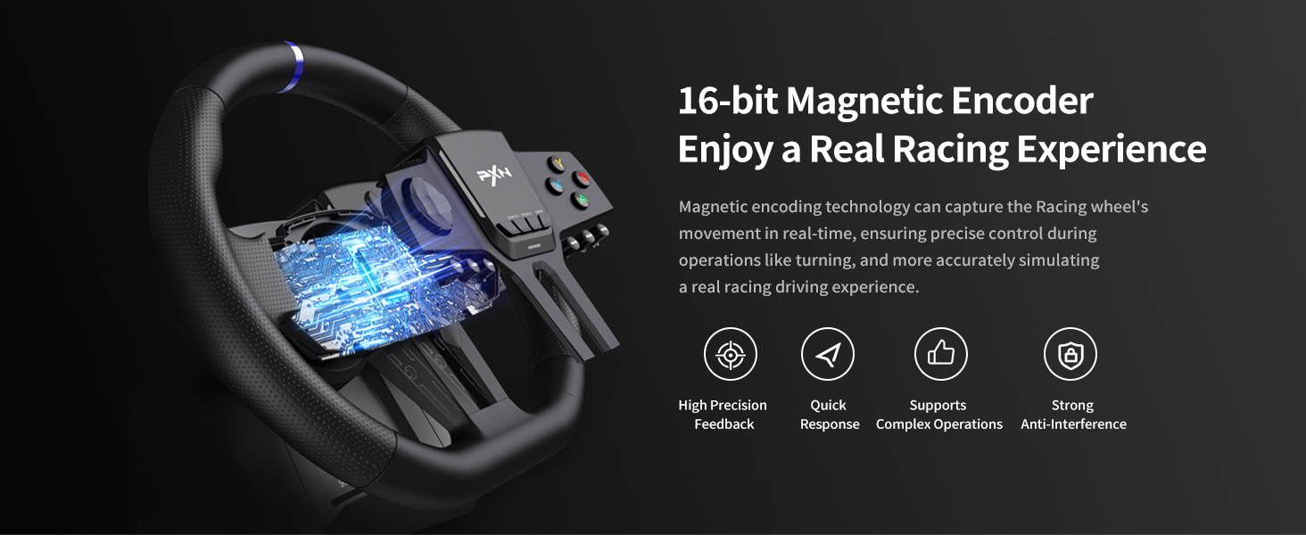 - FASTER, MORE ACCURATE, AND BUILT TO LAST: The PXN V900 Gen2 racing steering wheel features a modernized design with upgraded gaming technology. It integrates a 16-bit magnetic encoder for precise control, dual-motor asymmetric vibration, and Hall Effect pedals for smooth throttle and braking.