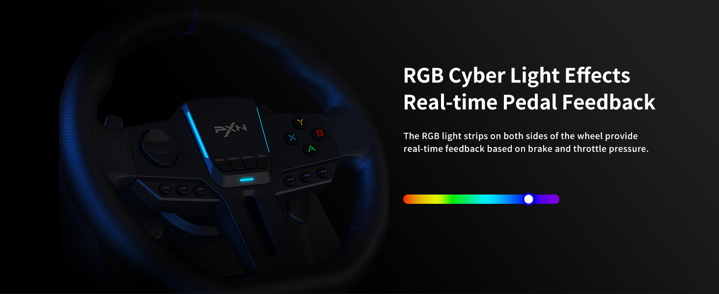 Custom Control & Driving Modes: 270°/900° Steering Modes: Switch to 270° for arcade-style racing or 900° for realistic simulation. Adjustable via PXN Wheel App. PXN Wheel App: Customise steering range, vibration strength, button mapping, and RGB lighting for a tailored setup. RGB Light Strip: Reflects real-time pedal input for immersive and dynamic lighting effects.
