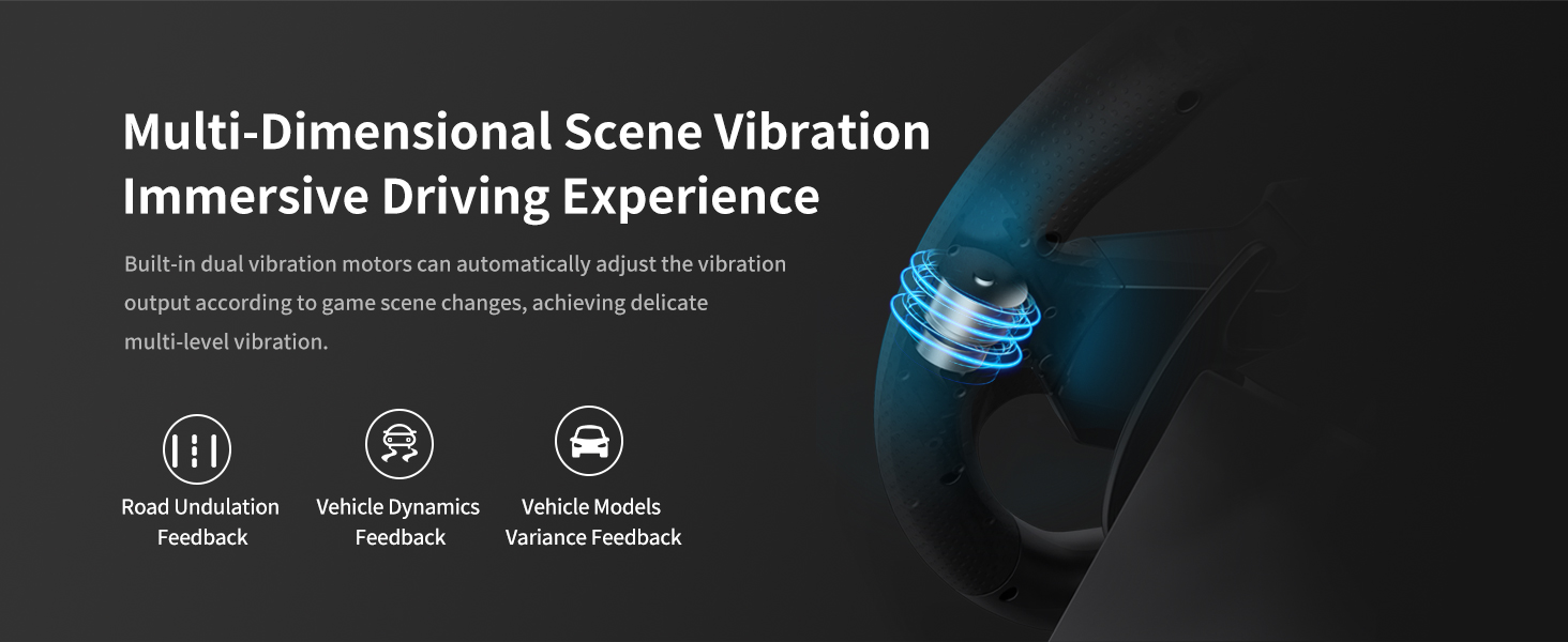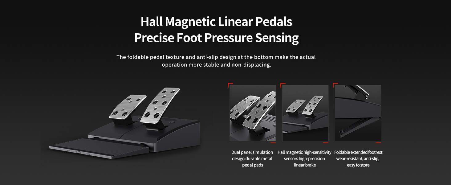 Precision & Realistic Feedback,16-Bit Magnetic Encoder captures subtle steering inputs with accuracy and no dead zone, ideal for racing simulators. Dual Vibration Motors simulate road surfaces, bumps, and crashes for a more lifelike driving experience. Hall-Effect Linear Pedals provide reliable, smooth throttle and brake control with minimal wear over time.