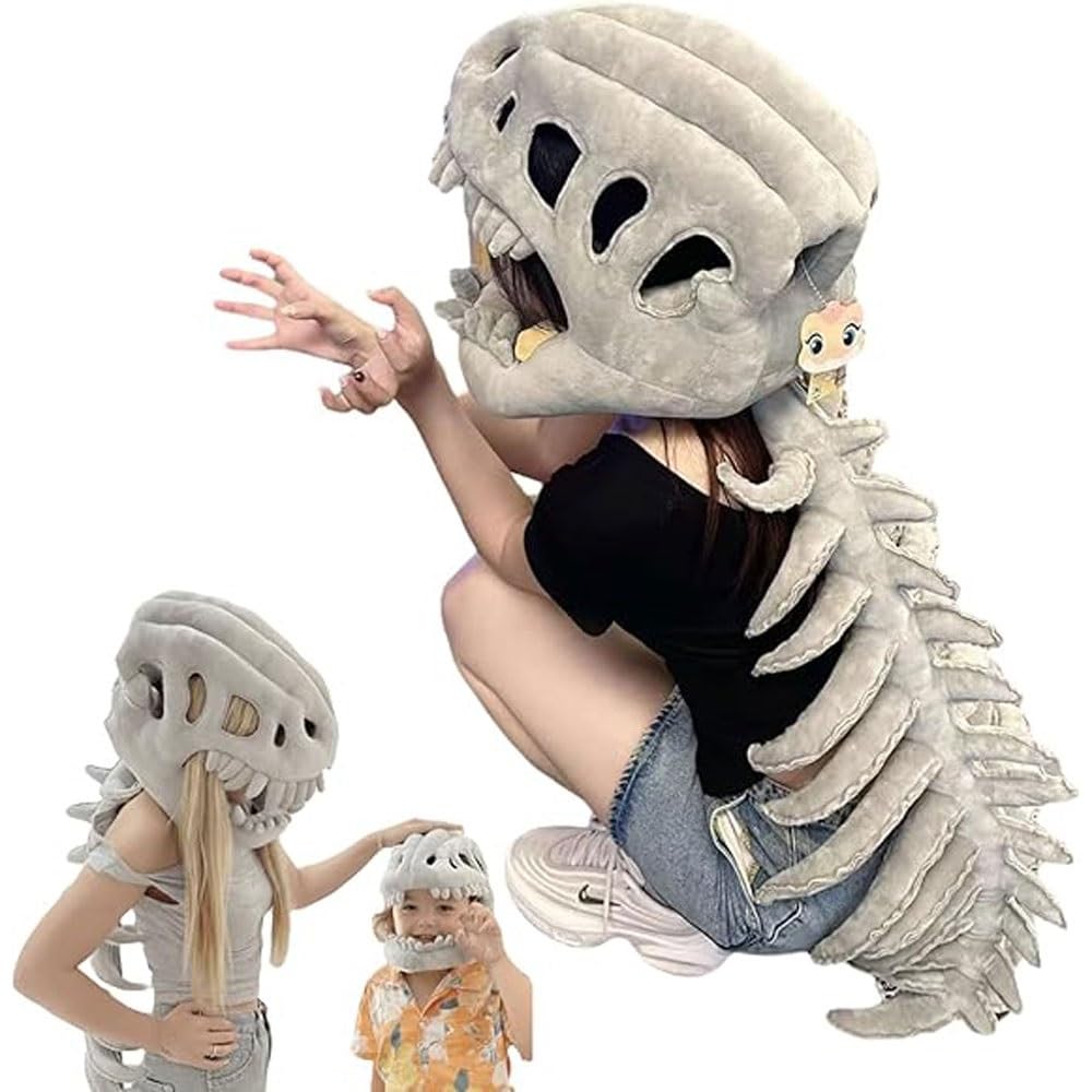 Realistic Dinosaur Skeleton Costume Set, Wearable Skeleton Plush, Dinosaur Skull Headpiece and Spine Costume for Adult Kids(75cm)