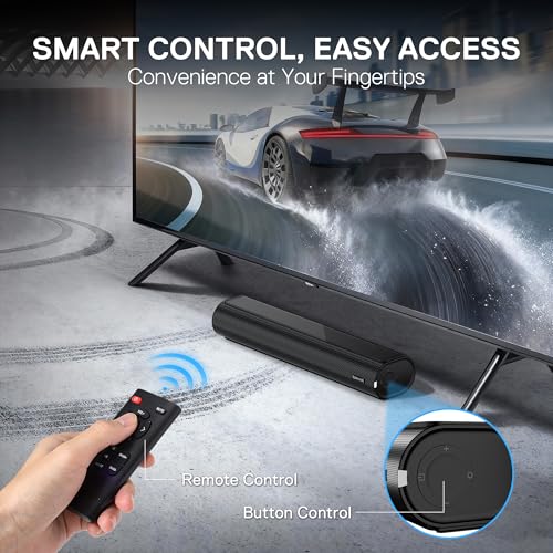 - Full Control at Your Fingertips: Convenient on-unit buttons let you power on/off, adjust volume, and switch modes with ease, while the RGB indicator light clearly displays the current input status. Use the included remote to fine-tune bass/treble, toggle EQ modes, or change input sources—giving you complete wireless control of your soundbar from anywhere in the room