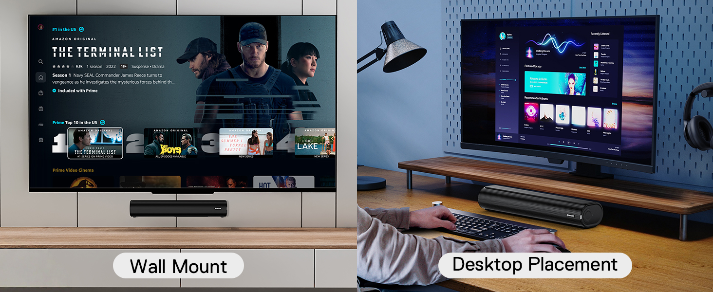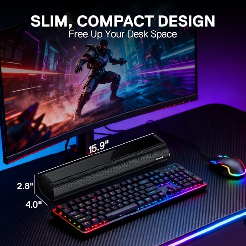 - Compact & Modern Design: Crafted with a sleek, modern aesthetic, this wall-mount soundbar fits effortlessly under your monitor or can be easily mounted on a wall. The space-saving design enables it to blend easily into any environment and maximize the utilization of space—ideal for home offices, bedrooms, and gaming setups