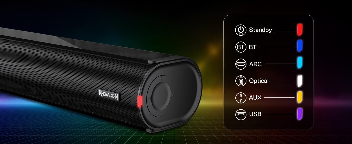 The unique side LED light changes color to match your selected input. Easily identify the active input source (BT, Optical, HDMI ARC, AUX, etc.) by its color at a glance; no guessing needed.