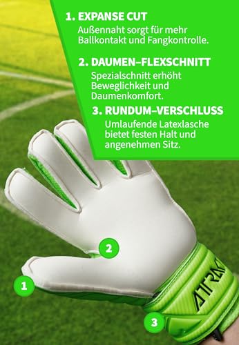 Expanse cut: the outer seams increase the palm of this flat cut, increasing the contact area between latex and ball. For even better grip and precise ball control.