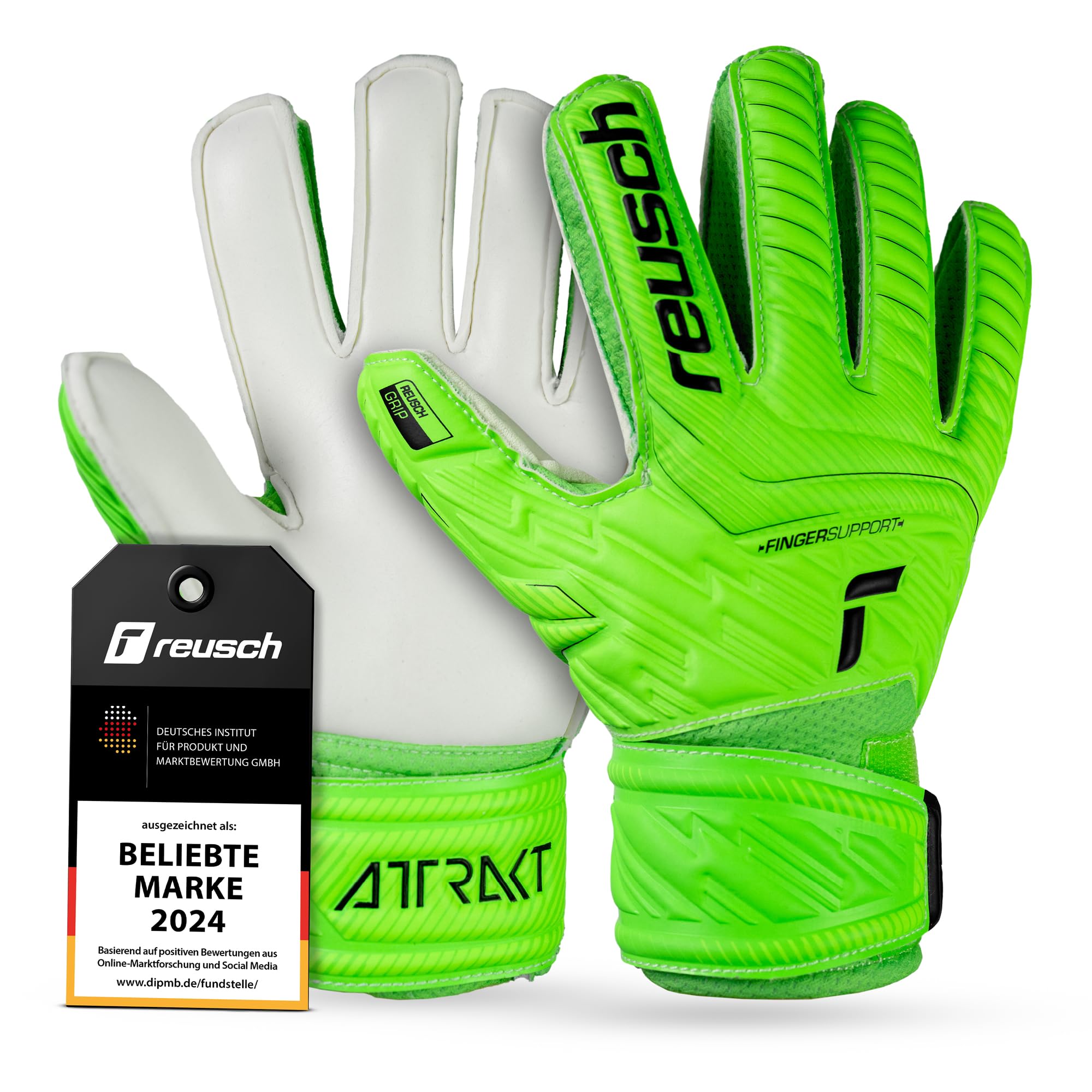 The Reusch Attrakt Grip Finger Support Junior with finger protection – Reusch goalkeeper gloves children and teenagers – appears in a new design and is the optimal choice for all ambitious young goalkeepers. The processed Reusch Grip coating is made from a high-quality adhesive foam and guarantees good grip and reliable durability for these football gloves thanks to its high proportion of high-quality natural latex. The Reusch Grip Latex made in Germany forms the basis for a total of eleven other unique latex blends. All foams have been developed with unique compositions, additives and finishes that increase the performance of the product and the keeper. The processed, soft materials make the glove even more comfortable, and thanks to the ideally coordinated material composition also very breathable. The expanse cut outseam construction of this regular cut maximises the surface area for ball contact and increases catch safety. The reliable finger protection system, which consists of five protection rods, reduces the risk of overstretching while keeping the glove soft and flexible. The vertical opening on the inside of the cuff ensures easy and quick entry into the glove. The incision of the palm between the thumb and index finger optimises the flexibility of the thumb and ensures an ergonomic shape. The fully all-round bandage is our proven attachment system for maximum stability and super comfort.