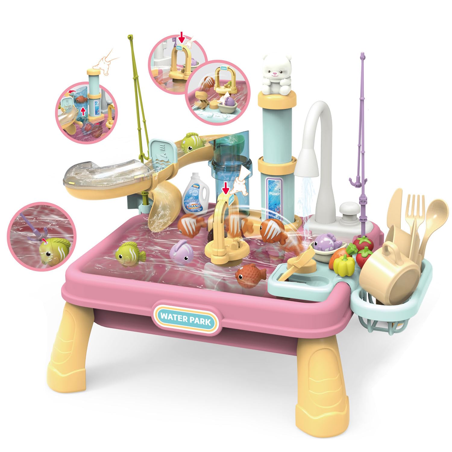 - Real Water Flow – Battery pump circulates water through the tap for realistic sink play.