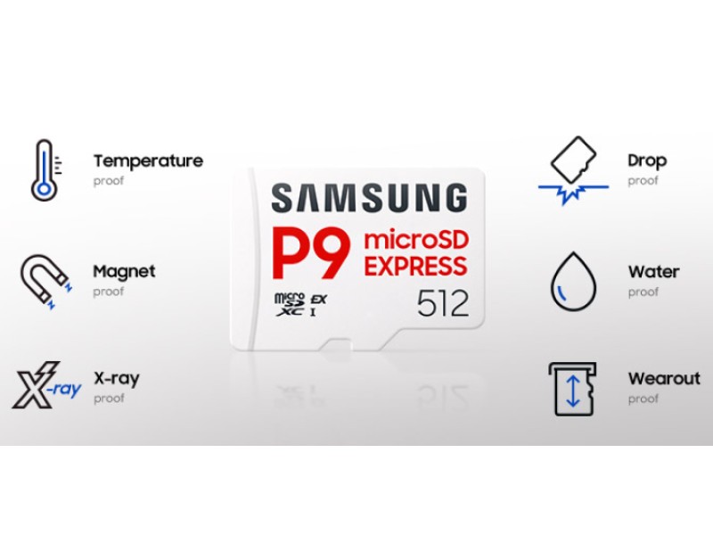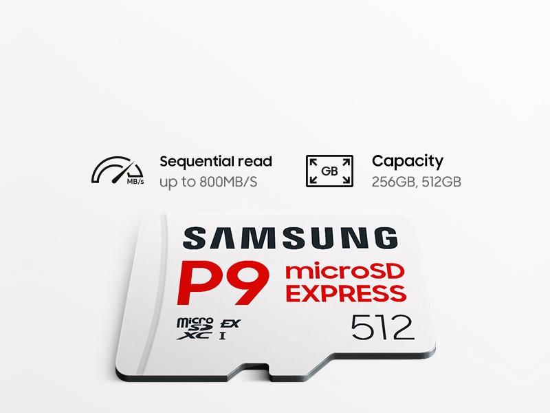 Customer Reviews 4.7 out of 5 stars21 4.8 out of 5 stars218 4.7 out of 5 stars1,108 4.7 out of 5 stars6,728 4.8 out of 5 stars2,630 Price £61.29 £16.99 £82.29 — £63.58 Read speed 800 MB/s 180 MB/s 160 MB/s 180 MB/s 200 MB/s Compatibility Nintendo Switch 2 Mobile gaming, console Smartphone, Tablet Mobile gaming, console Action Cam, DSLR, Drone Six‑fold protection ✔ ✔ ✔ ✔ ✔ Capacity 256 – 512 GB 128 GB – 1 TB 64 GB – 1 TB 64 GB – 1 TB 128 GB – 512 GB Includes SD adapter ✘ ✔ ✔ ✔ ✔ Manufacturer’s coverage 3‑year limited coverage 10‑year limited coverage 10‑year limited coverage 10‑year limited coverage 10‑year limited coverage ¹ Copyright Nintendo. Nintendo Switch is a brand owned by Nintendo. ² Based on internal tests with the P9 Express microSD card 512 GB, measured using a PCIe test board compared to UHS‑I microSD cards, tested with the PRO Ultimate microSD card 512 GB and Samsung card readers. Actual performance may vary depending on host device, interface, usage conditions and other factors. ³ The products shown are for illustrative purposes only. ⁴ 1 GB = 1,000,000,000 bytes. Actual storage capacity may be less than stated. Part of the memory may be used for system files and other storage management purposes. ⁵ Availability may vary by market and time. ⁶ Water‑resistant: up to 1m depth, 3% NaCl saltwater, 25°C, 72 hours. ⁷ Temperature‑resistant: operating temperatures 0°C to 45°C; storage temperatures −40°C to 85°C. ⁸ X‑ray‑proof: up to 100mGy, equivalent to airport X‑ray scanners. ⁹ Magnet‑resistant: up to 15,000 Gauss (magnetic field equivalent to a high‑field MRI), 30 seconds. ¹⁰ Drop‑proof: withstands drops from up to 1 metre, 10 cycles. ¹¹ Wear‑resistant: up to 10,000 insertion cycles. ¹² The results listed here were achieved under controlled laboratory conditions during internal testing, as described in the respective footnotes for each test. Samsung is not liable for damage and/or loss of data or costs incurred from data recovery from a memory card. Full coverage terms at: samsung.com/uk/support/¹³ Compatible with devices with a microSDXC card slot and microSD Express host devices. Transfer speed may be limited to UHS‑I speeds depending on host device compatibility. ¹⁴ Samsung Magician software is available for Windows, macOS and Android. Requires Windows 7 or later, macOS High Sierra (10.13.6) or later, or Android 5.1 (Lollipop) or later. Older versions of Windows, macOS and Android may not be supported.