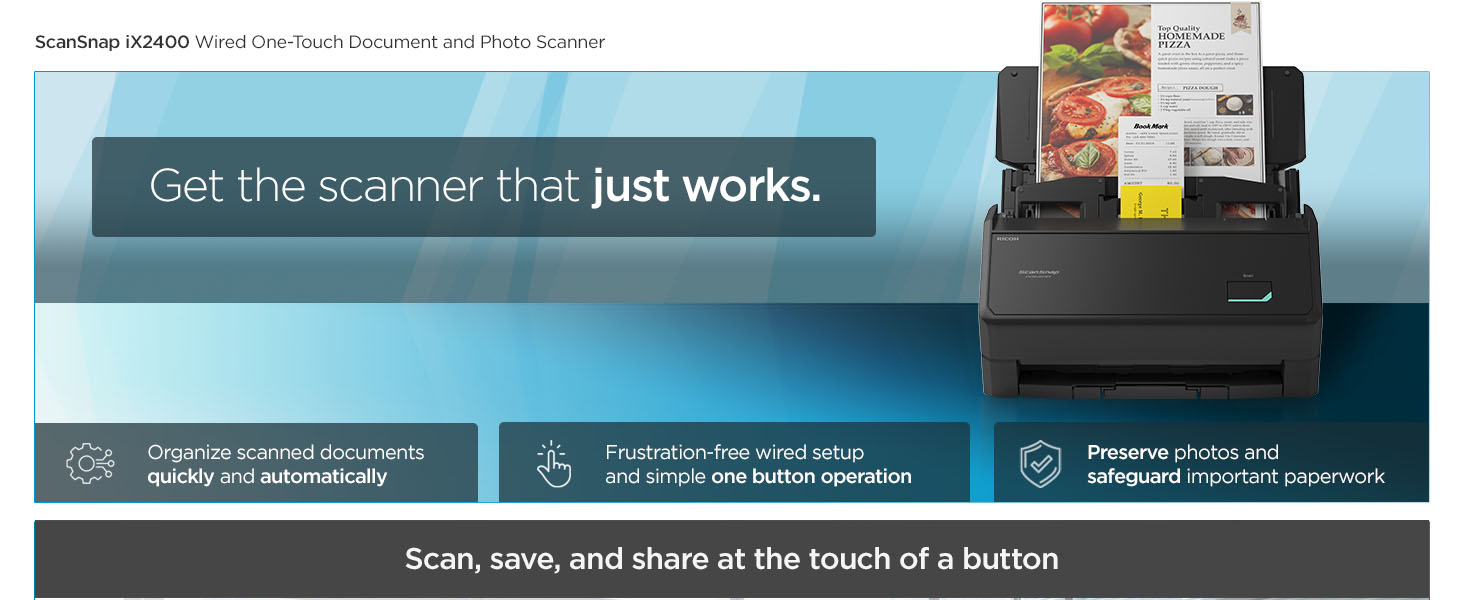 One touch is all it takes. The ScanSnap iX2400 scans, saves, and organizes your documents fast, easy, and hassle-free.