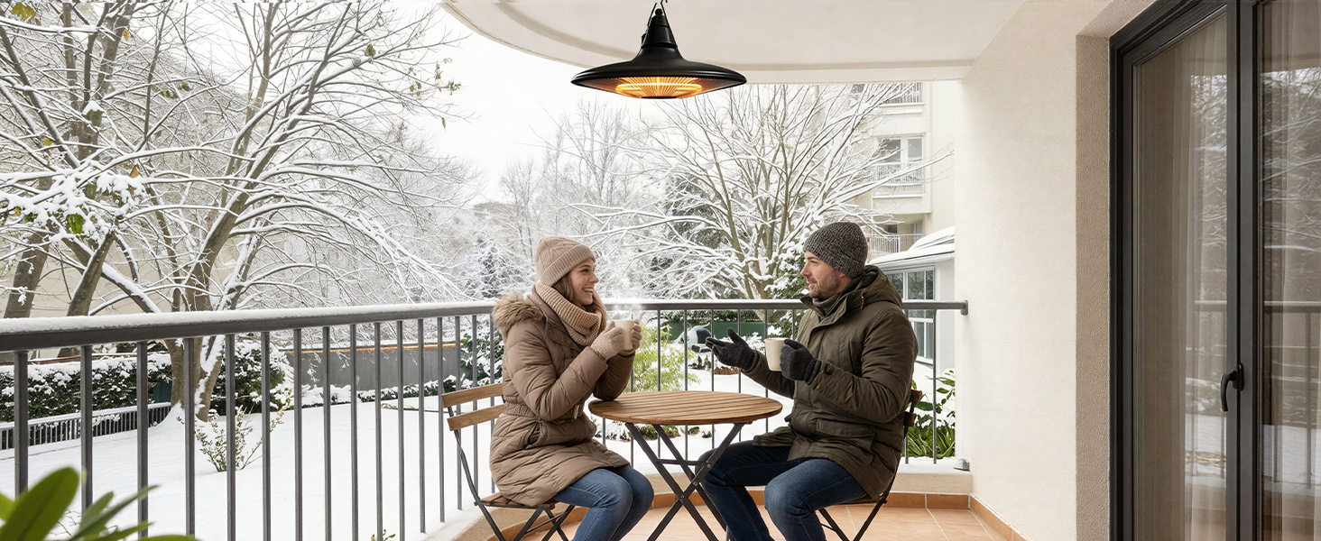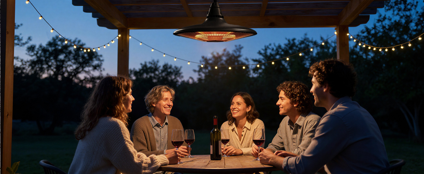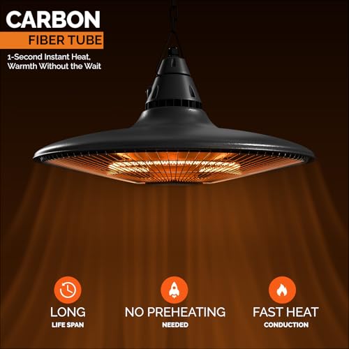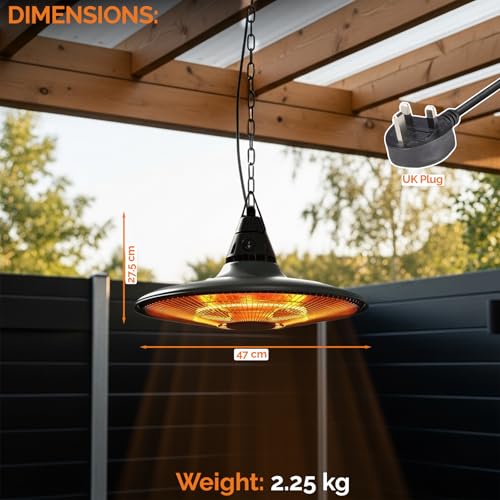 - 360° Overhead Heating That Saves Space: Mounted from the ceiling, this heater sends heat evenly in every direction, warming everyone underneath with full 360° coverage. No cold spots, no blocked heat flow, and no bulky floor heaters taking up space. This makes it perfect for dining tables, garden seating sets, outdoor cafés, gazebos, tents, or any area where you want wide, consistent heat coverage without clutter.