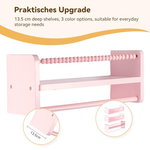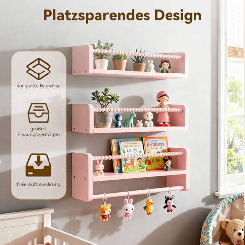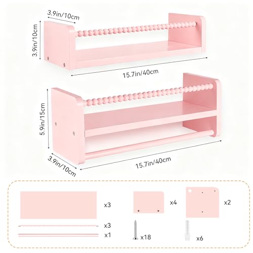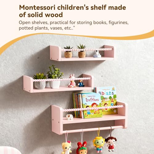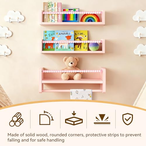 Set of 3 40cm Nursery Shelves Floating Book Shelf for Wall, Solid Wood Kids Bookshelf, Baby Room Wall Decor Organizer for Nursery Bedroom Floating Shelves with Wooden Bead Fence (Pink)