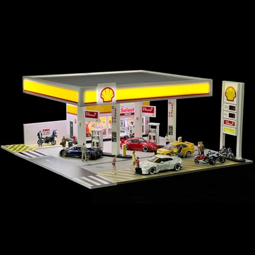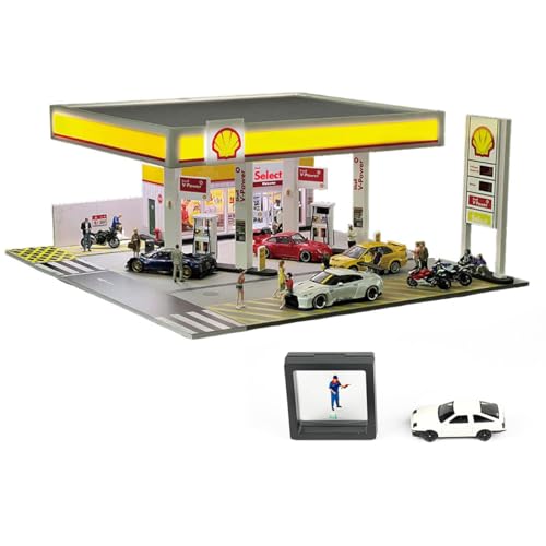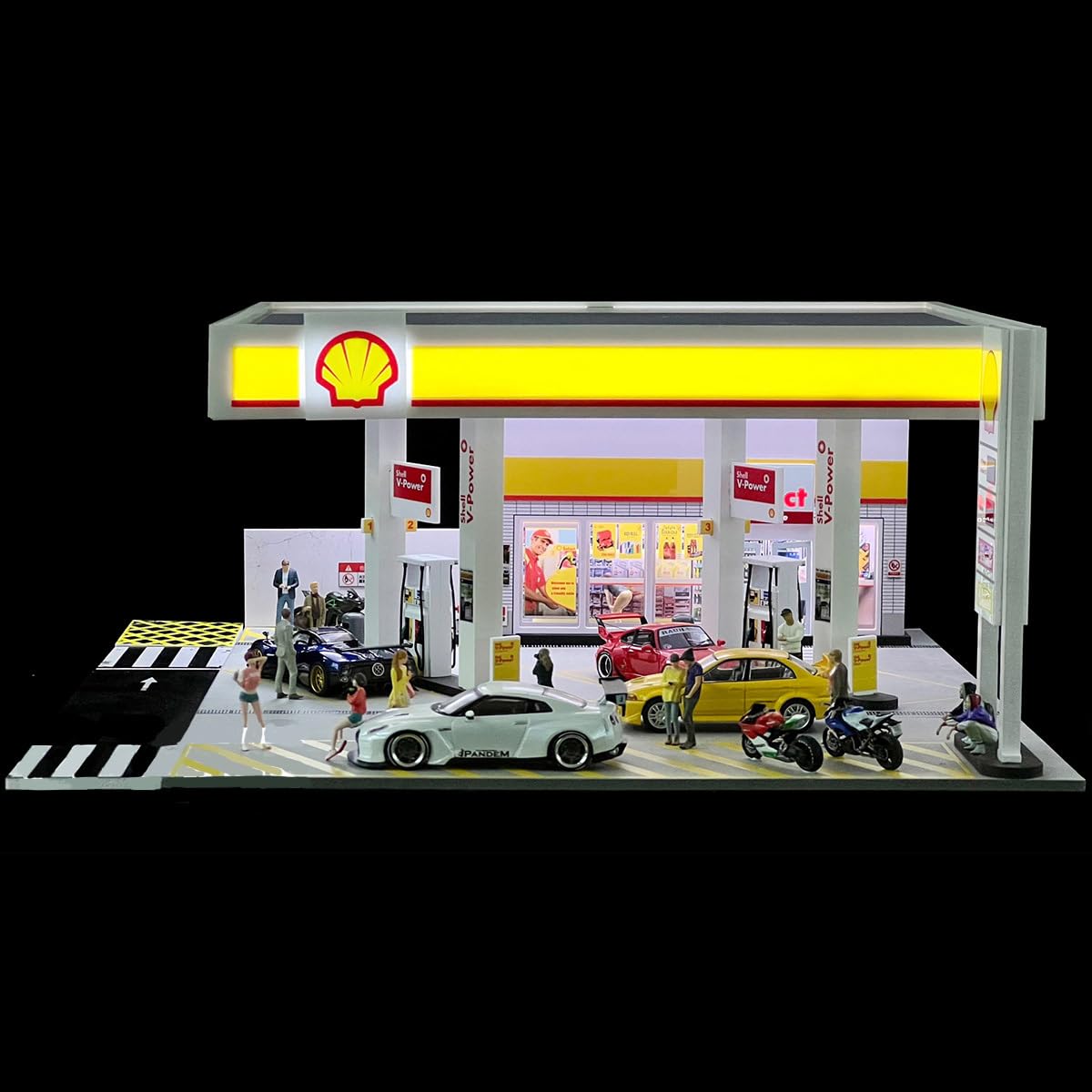 Shell Gas Station Model Shell Gas Station 1:64 Diorama with Car and Figure, Detailed Miniature Scene for Collectors