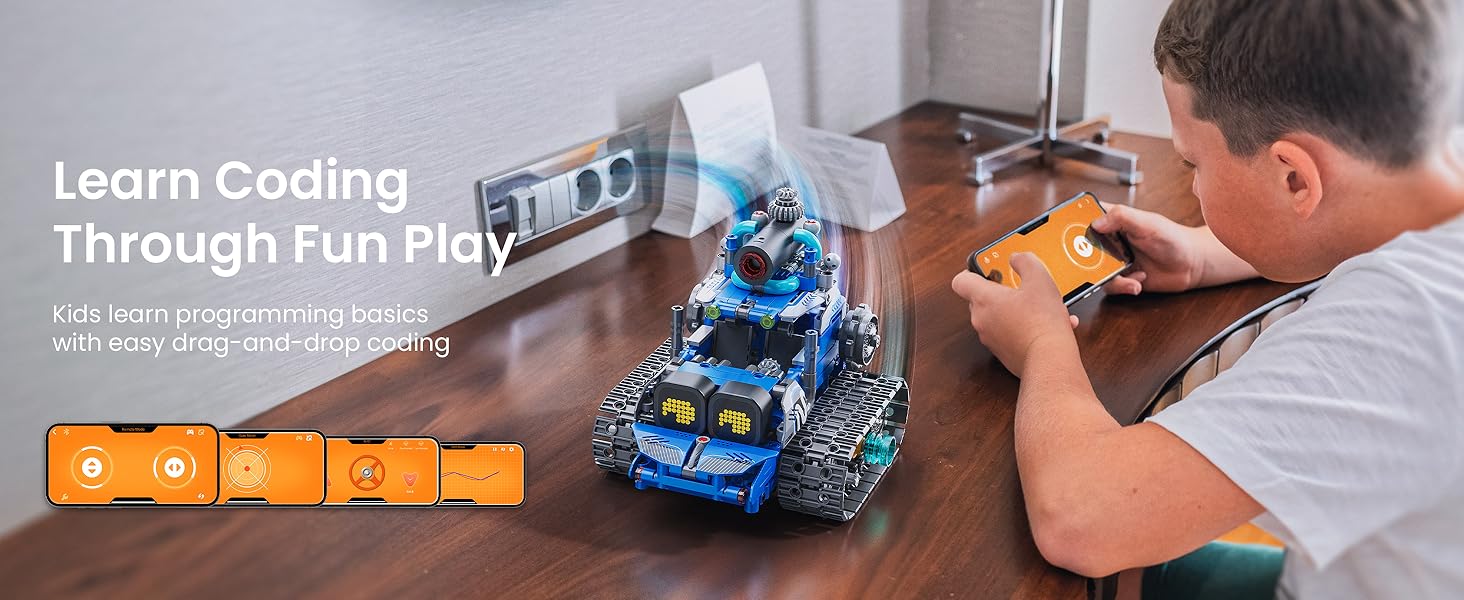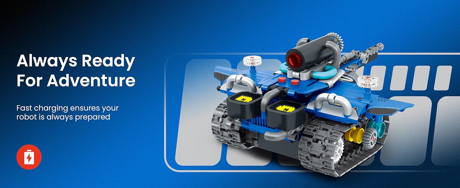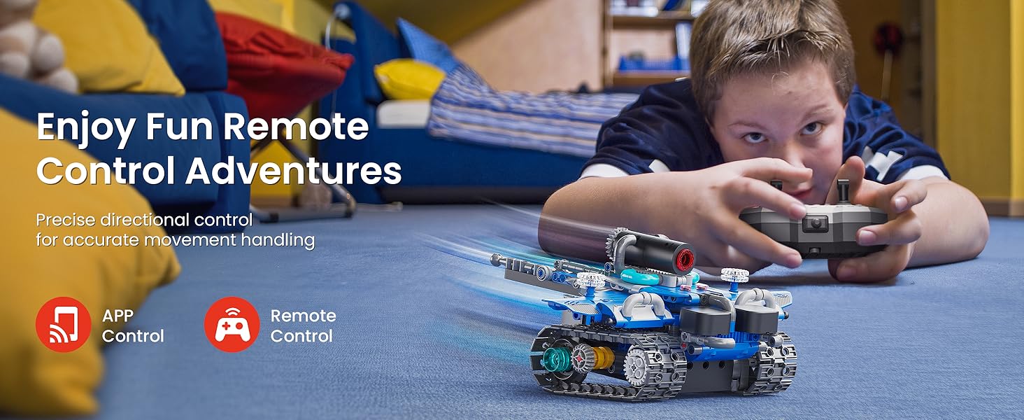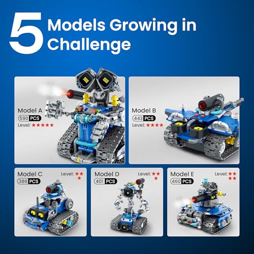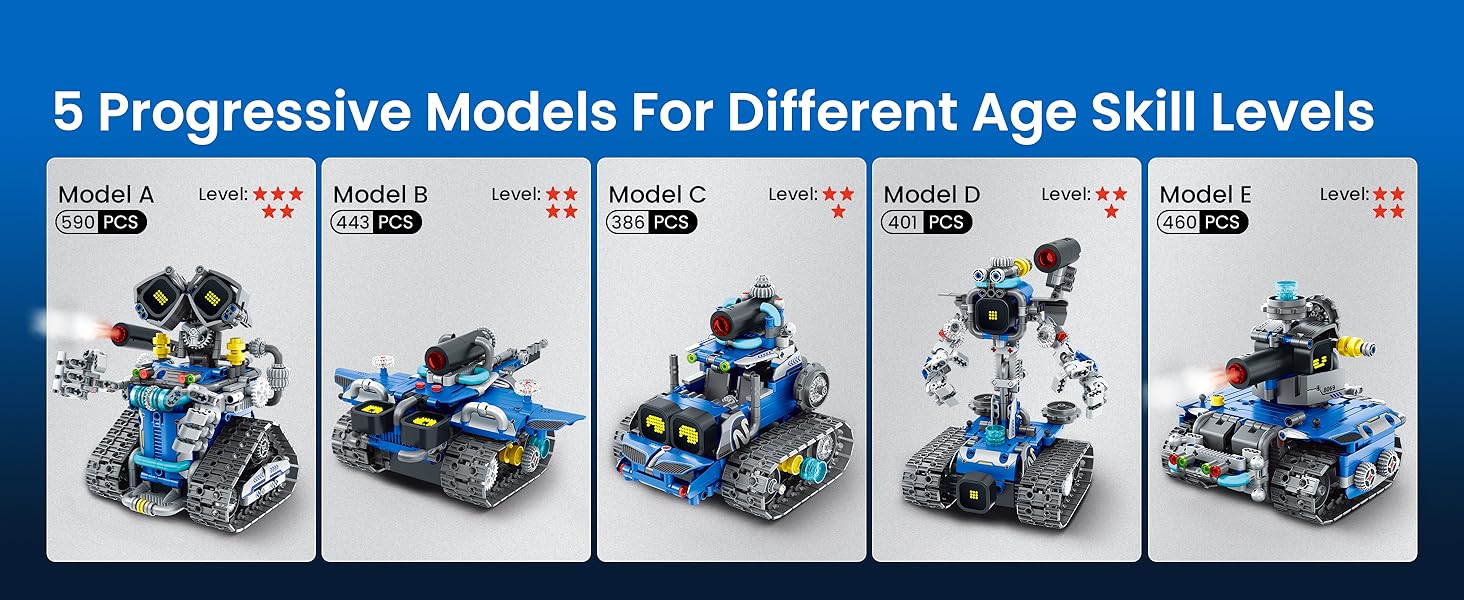 Building Experience: The 596pcs programmable robot sets for boys 7-14 offers the fun of STEM learning. Boys can build five fun designs: Robot, Tank, Battle Car, and more. Each model has a different difficulty level, letting kids start simple and gradually take on more challenging builds